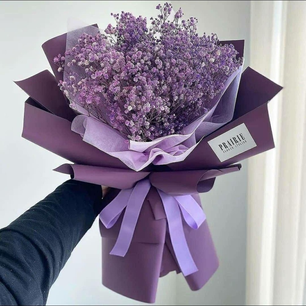 A charming bouquet of soft purple baby’s breath, elegantly wrapped in deep violet tones and accented with pastel layers, creating a luxurious and calming display.