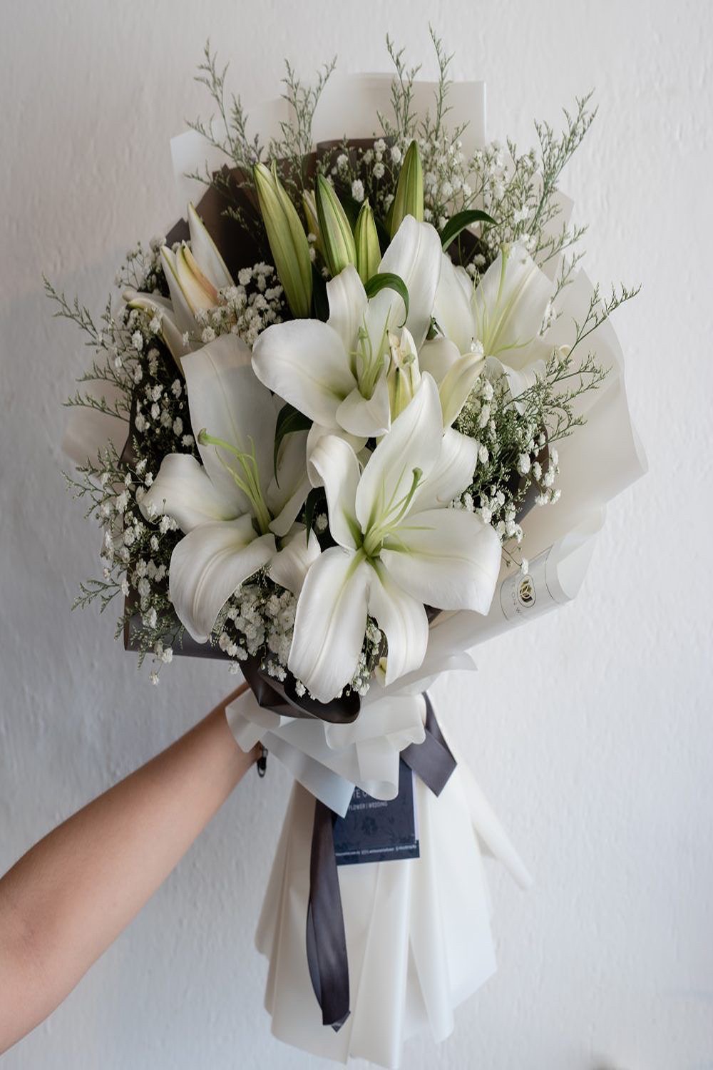 A sophisticated bouquet of pure white lilies and delicate baby’s breath, exuding timeless elegance.