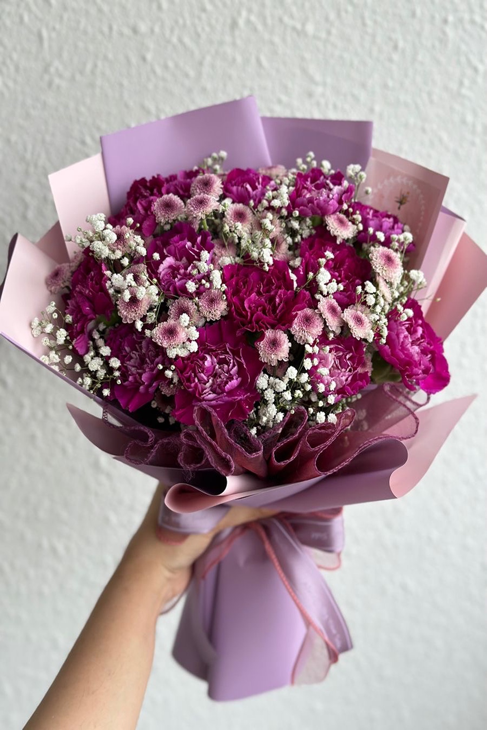 A dramatic and beautiful bouquet of rich purple carnations and delicate pink blooms, softened by baby’s breath and wrapped in pastel tones to highlight its vibrancy.