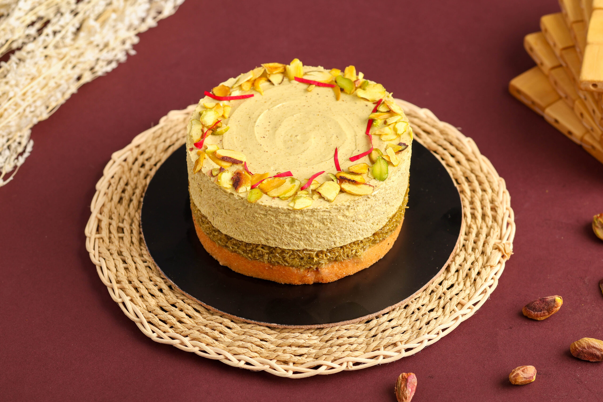 The fresh, aromatic pistachio flavour blends beautifully with the buttery kunafa, creating a unique dessert that is rich, indulgent and truly premium. Freshly prepared and 100% eggless, this cake is perfect for birthdays, festive celebrations, special occasions or gifting—especially for those who enjoy innovative and exotic desserts.