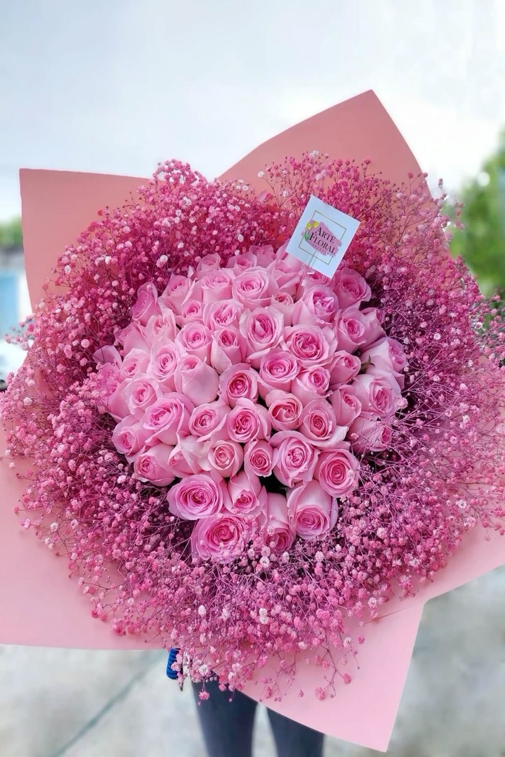 A luxurious bouquet of pink roses surrounded by delicate pink baby’s breath. Wrapped in soft pastel tones, it radiates romance and beauty. A vibrant floral arrangement perfect for meaningful celebrations.