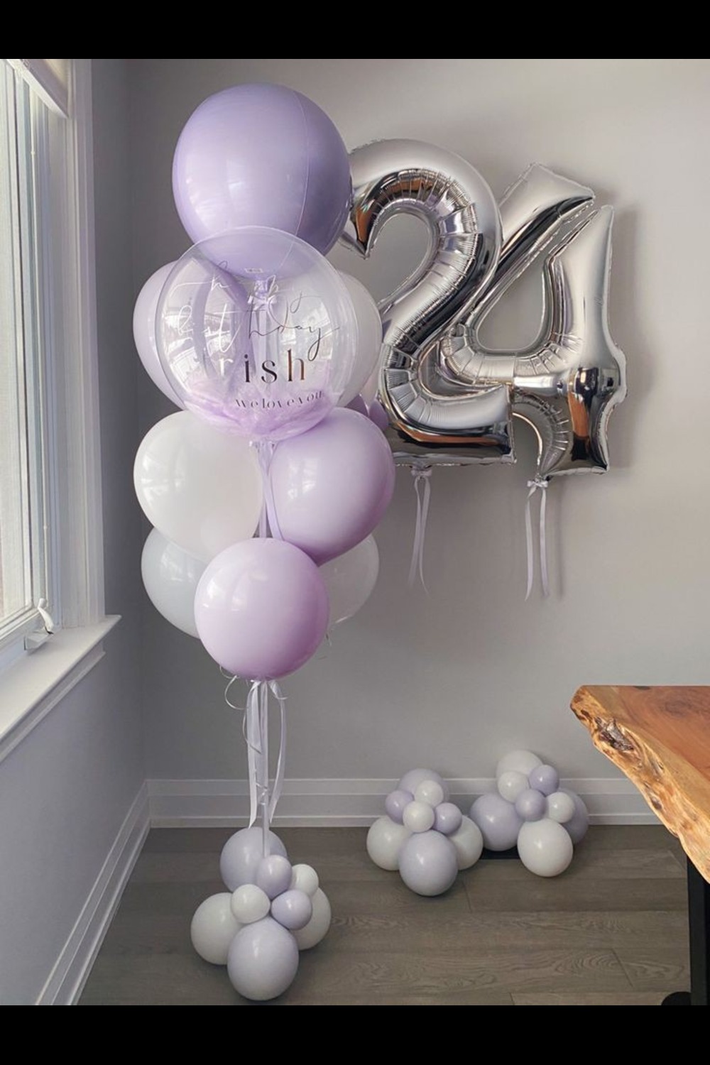 A beautifully curated balloon ensemble featuring gentle lavender tones, silver accents, and a decorative base for a polished presentation.