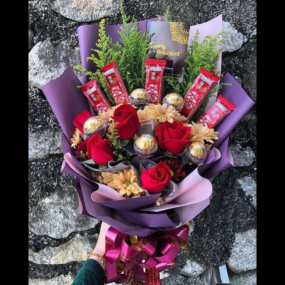A combination of deep red roses and sweet chocolates, elegantly wrapped with purple highlights.