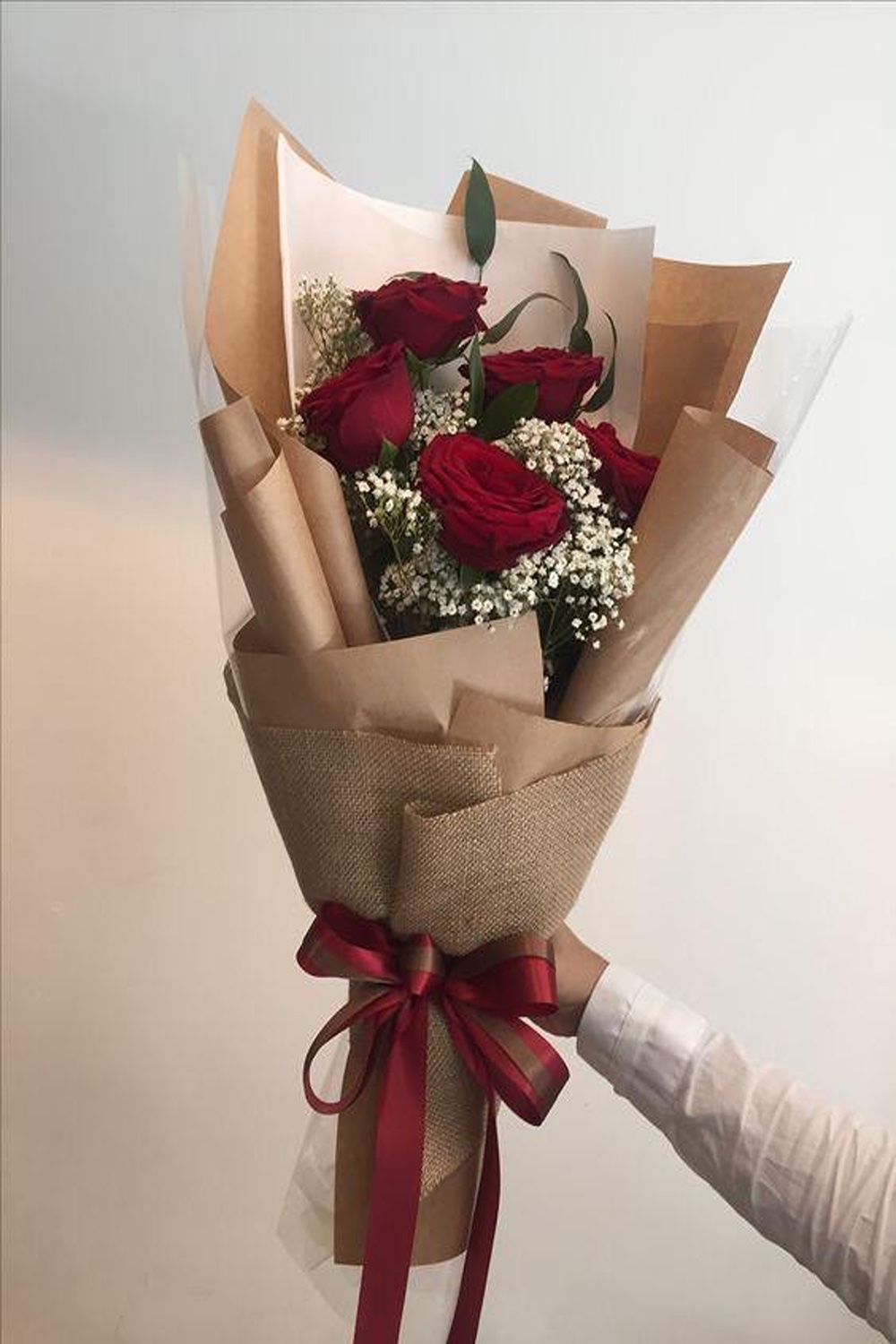arrangement of deep red roses surrounded by delicate baby’s breath, beautifully wrapped in earthy burlap and tied with a rich red ribbon for a timeless appeal.